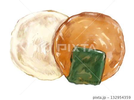 美味しそうな白いせんべいと醤油のり煎餅の手描き水彩イラスト
