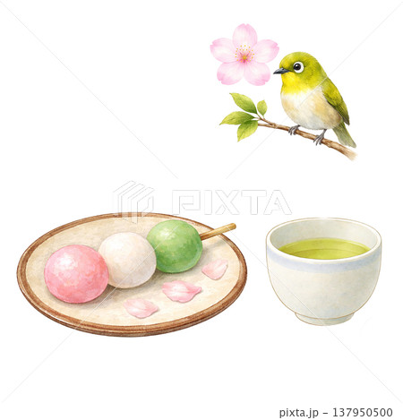 団子と緑茶 小鳥 桜 春 和カフェ 水彩イラスト素材