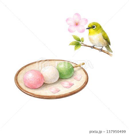三色団子 小鳥 お花見 春 和菓子 水彩イラスト素材