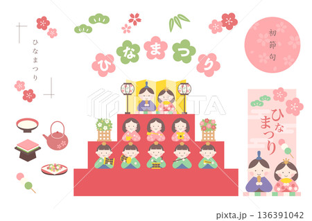 ひなまつりの雛人形と春のモチーフが揃った可愛いイラスト素材