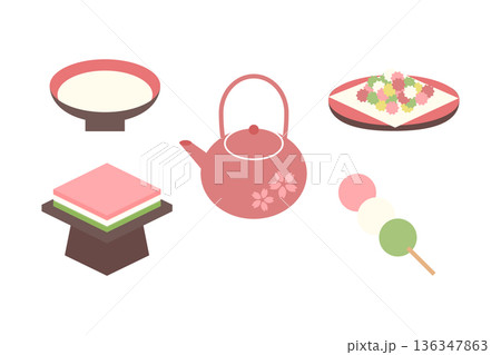 ひな祭りの和菓子と飲み物を描いたかわいいベクターイラスト素材