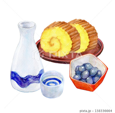 水彩イラスト 手描きイラスト 伊達巻と日本酒