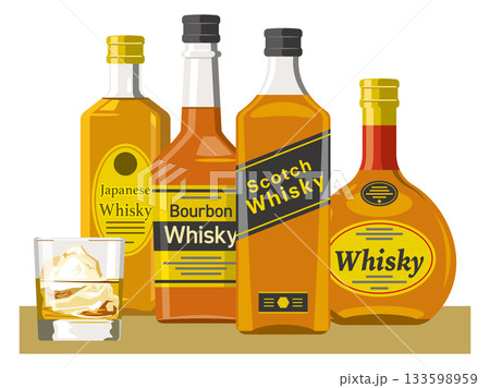 並んでいるウイスキーボトルとグラスのイメージイラスト