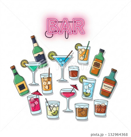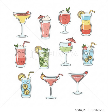 カクテルの手描きイラストステッカーセット バー、ホテル、ナイトクラブ素材