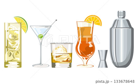 カクテルのセット 飲み物(お酒)の手描き水彩イラスト素材