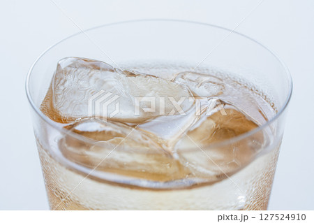 白背景で麦茶の入ったグラスに氷を入れる瞬間