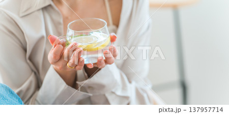 ソファーに座りレモン水,デトックスウォーターを飲む女性
