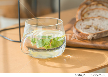 テーブルにあるフレーバーウォーター,レモン水と軽食のパン