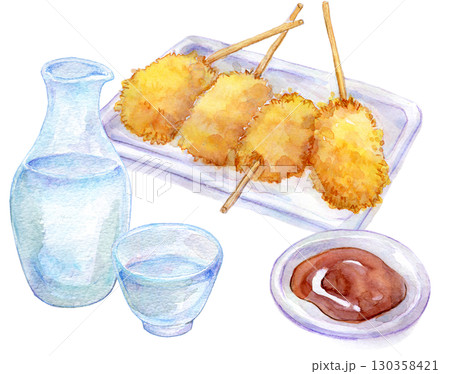 水彩イラスト 手描きイラスト アジフライと冷酒