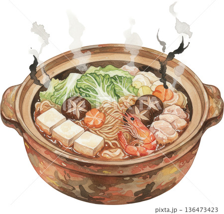 土鍋で煮込んだ温かい冬の鍋料理の水彩画風イラスト