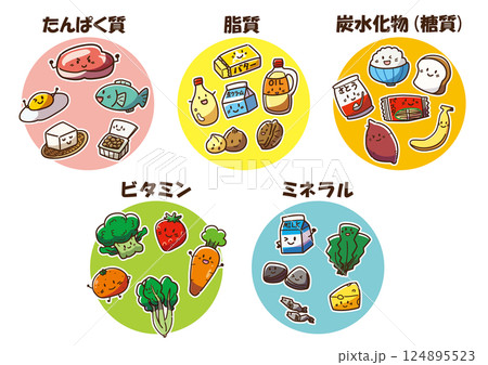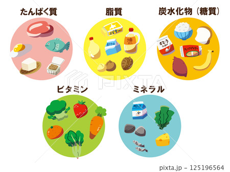 5大栄養素イメージ(炭水化物・タンパク質・脂質・ビタミン・ミネラル)の円グラフ