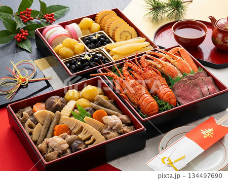 豪華な三段重のおせち料理と伊勢海老・日本の正月