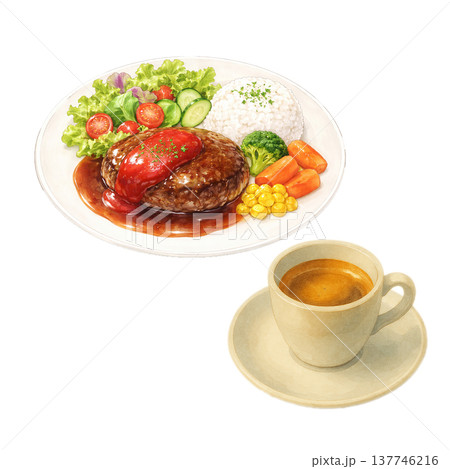ハンバーグプレート コーヒー付き 洋食ランチ 水彩イラスト