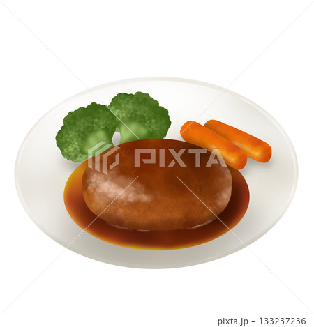 茹で野菜付きのデミグラスソースがかかったハンバーグ定食のイラスト