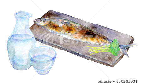 水彩イラスト 手描きイラスト 秋刀魚と冷酒