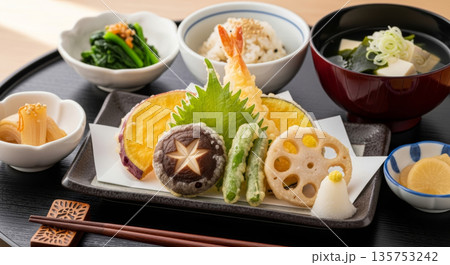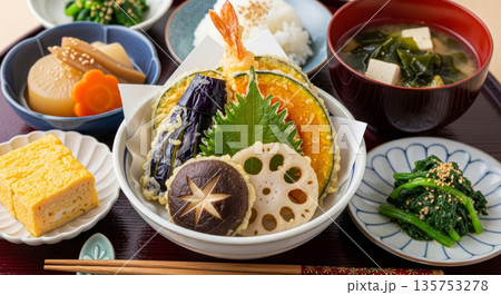 水彩風 天ぷら定食のイラスト素材(切り抜き・和食メニュー)