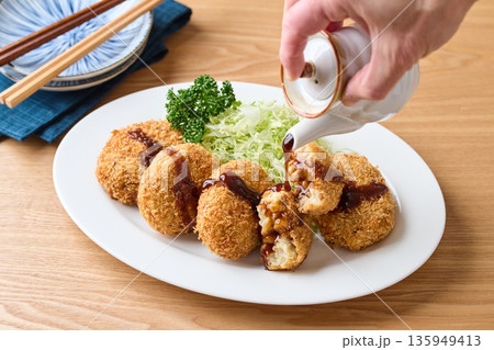 ポテトコロッケにソースをかける