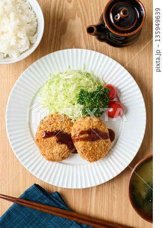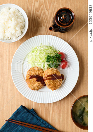 湯気が立ち上る揚げたてコロッケ定食 千切りキャベツとご飯味噌汁漬物付きの和食ランチ