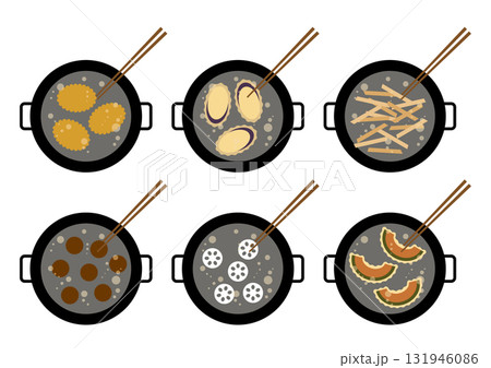 油はねしている揚げ物鍋とフライ天ぷらセット 水彩風手描きベクターイラスト