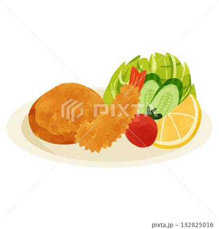 ポテトコロッケとエビフライのミックスプレート 水彩風手描きベクターイラスト