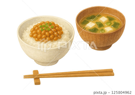 納豆ごはんと味噌汁の朝食セット|水彩イラスト・和食・白背景