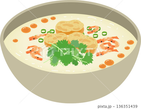 Bubur Ayam or Rice Porridge with Shredded Chicken, Eggs, and Meatballs. Asian Food Illustration