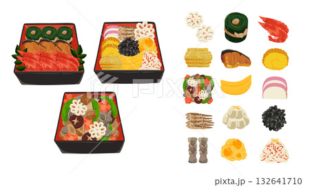 日本のおせち ベクターイラストセット(日本の伝統的なお正月料理, 重箱, お屠蘇, 祝箸)