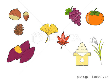 9月 季節の線画イラストセット(秋の食べ物・花・お月見)