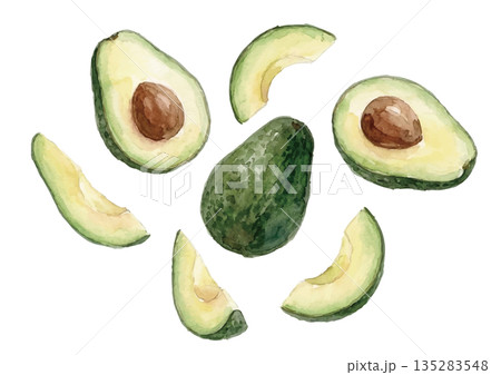 水彩で描いたカットしたアボカドのベクターイラストセット