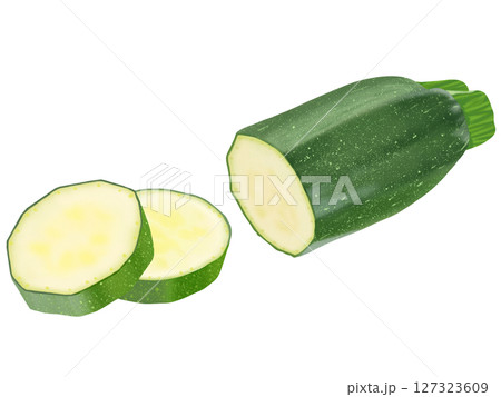 夏野菜 ズッキーニ一本とカットされたズッキーニの断面。焼いても煮てもおいしい。