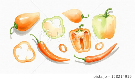 水彩風 カラフルなパプリカの背景 フレッシュ ピーマン 白背景