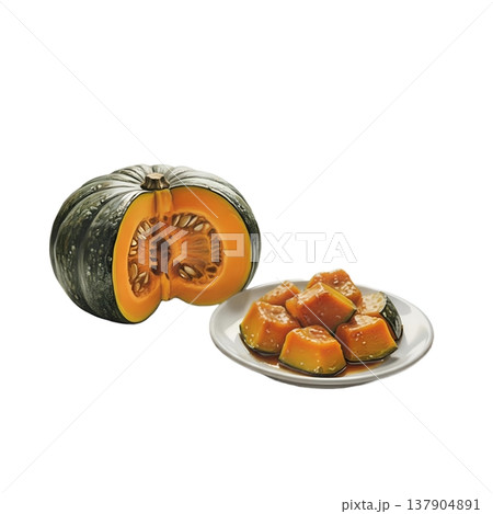 手描き水彩 かぼちゃの煮物イラスト 白い器に盛り付け 冬至・冬の食卓素材