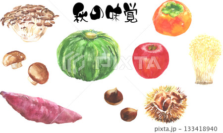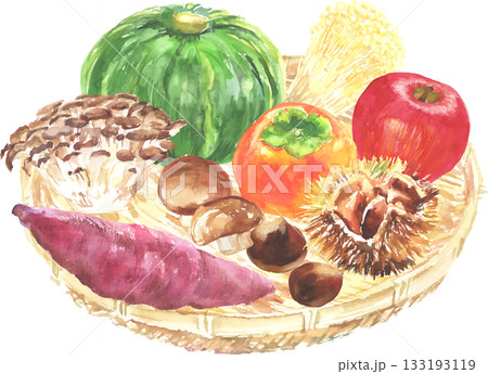 秋の収穫物を集めた水彩イラスト。柿、栗、サツマイモ、カボチャ(ベクター)