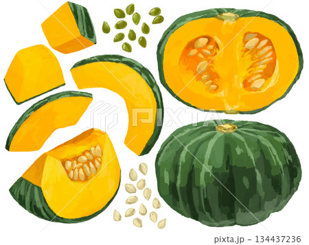 いろいろな切り方のかぼちゃのイラストセット【野菜 食べ物 種】