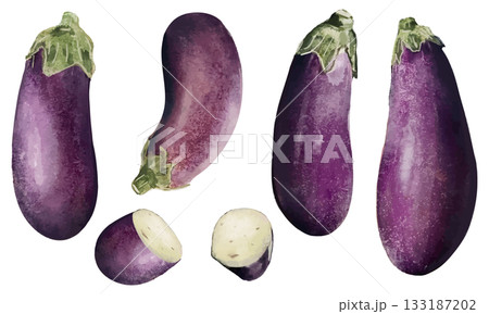 水彩で描いた夏野菜の採れたてナスのカット野菜 イラスト素材