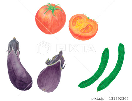 トマト・ナス・きゅうり 夏野菜の水彩手描きイラスト素材セット
