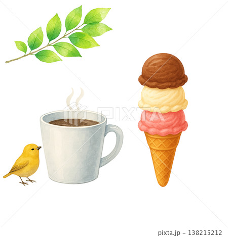 コーヒーとアイスクリームと小鳥のシンプル素材 ナチュラルなカフェデザートイメージ 白背景