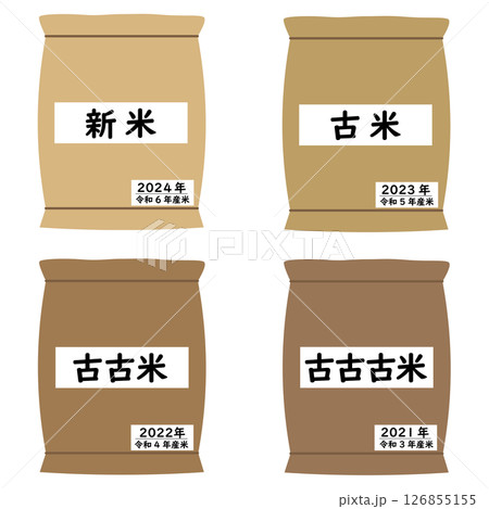 お米の種類のセットイラスト。新米と古米(備蓄米)の名称と収穫年