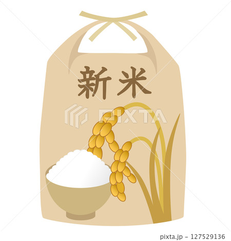 手描きの稲穂がデザインされた米袋に入った新米のイラスト