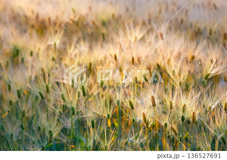 【新緑素材】朝日を受けて輝く青麦【長野県】