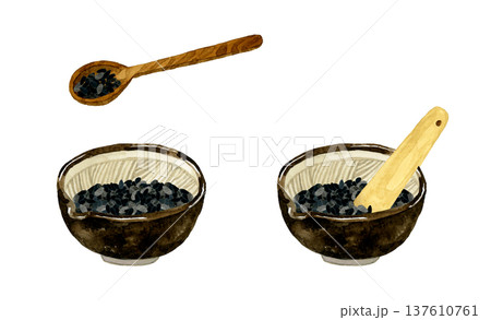 木製の器に入った黒ゴマ 野菜・薬味の手描き水彩イラスト素材