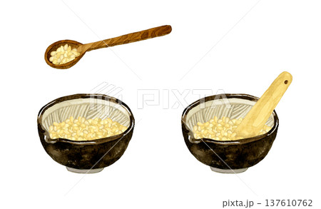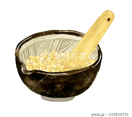 すり鉢に入った白ゴマとすりこぎのセット 野菜・薬味の手描き水彩イラスト素材
