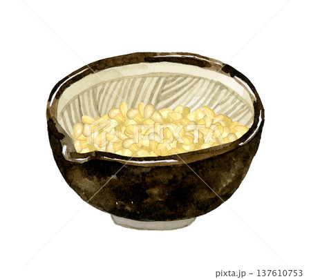 すり鉢に入った白ゴマ 野菜・薬味の手描き水彩イラスト素材
