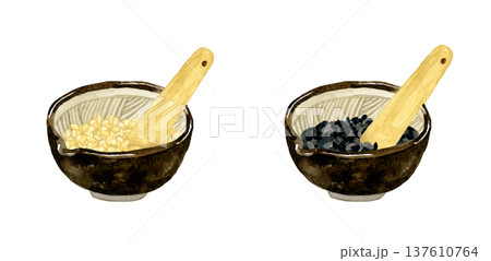 すり鉢に入った白ゴマ&黒ゴマと匙 野菜・薬味の手描き水彩イラスト素材