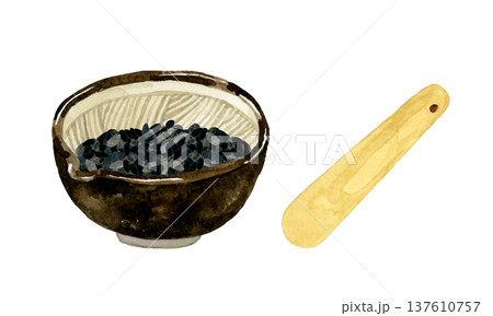 すり鉢に入った黒ゴマ 野菜・薬味の手描き水彩イラスト素材