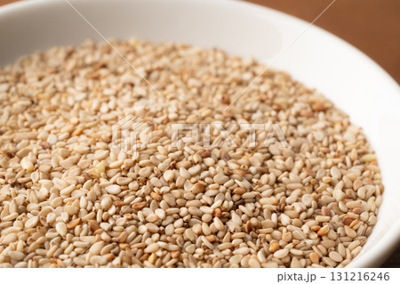 スプーンに載せた白ごま(生ごま)のクローズアップ