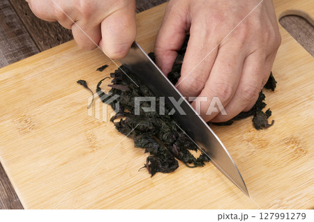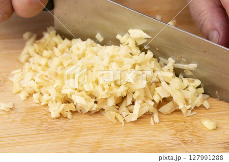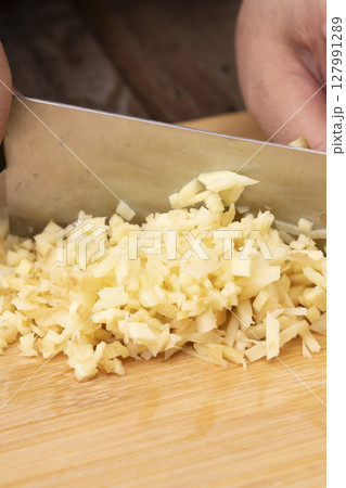 赤紫蘇のシロップを作った紫蘇がらでふりかけを作る工程 生姜のみじん切り