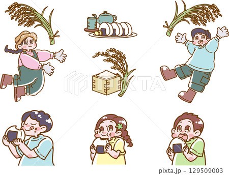 稲の収穫とオニギリを食べる子ども達のイラストセット