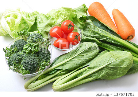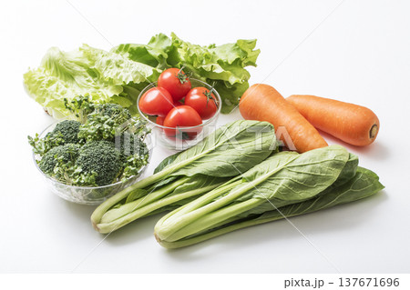 トマト、ニンジン、ブロッコリーを白背景で撮影
