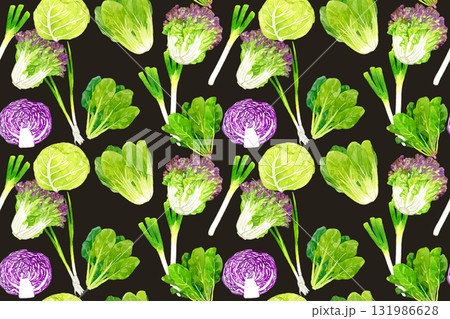 フレッシュな葉物野菜のシームレスパターン 手描き水彩イラスト背景素材